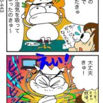 人の手で鼻を拭くゴンチチです。お菓子に少しでも近づきたい気持ちが彼を前へ前へと誘うのです。その結果、人のてはなんだか濡れ濡れ、気がつけば濡れ濡れなのでした。
