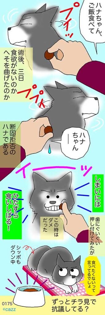 入院中、メシを食わず水も飲まない抗議運動の末、強制退去になったハナクソさん。そこまでして退院したのにご飯を拒否。つまりこれは医者というより我々へのアピールだったわけで。仕方ないのでウエットフードを指で歯に塗りつけてやりました・・・結果、食べて^^一回食べたらお腹減ってたらしく食べるようになりました。良かった^^