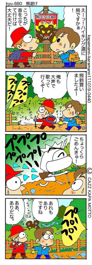 カッパの熊対策2026年3月15日 どうせカッパなんて不味いから食べられないでしょ、なんて失礼なことを言ってはいけません。空腹だったらなんでも美味い(余計に失礼?)万全の上に万全を期すことが大事です。勿論、人間もですよね。 カッパ漫画