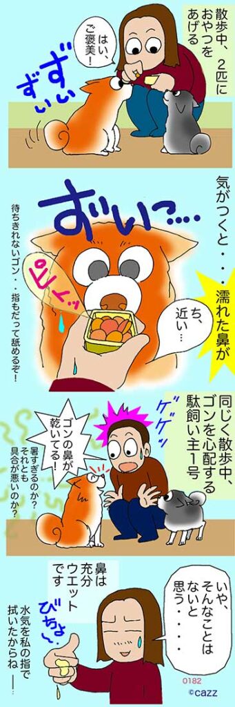人の手で鼻を拭くゴンチチです。お菓子に少しでも近づきたい気持ちが彼を前へ前へと誘うのです。その結果、人のてはなんだか濡れ濡れ、気がつけば濡れ濡れなのでした。
