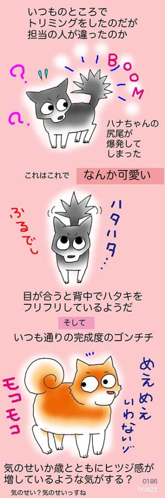 なんだかパンク?ハナちんの性格を考えると真にふさわしい?上に阿らず(少しはすぐに言うこと聞けよ)下に強い(自分より体の小さい子には更にガルル3割まし)そんな貴方にはこれほどふさわしいトリミングはないと飼い主は密かに思っております。