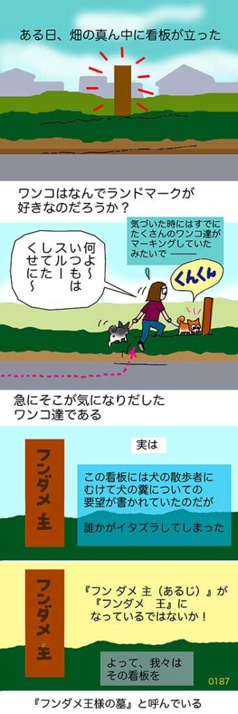 この看板ですが今ではもう劣化してなくなってしまいました。畑も持ち主が歳でできなくなったみたいで、耕作されなくなっています。土地の半分は売却されて家が立ちました。変化の少ない田舎ですが来る時は強烈です。ゴンとハナが2匹とも壮健だった頃とは散歩道も所々面変わりしています。The・時の流れって感じです。