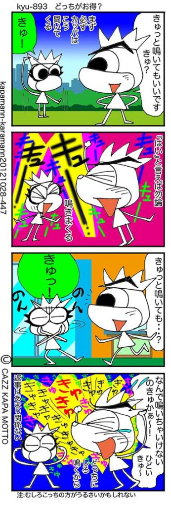 なんでわざわざ聞いてくるのだろうか?それは構ってちゃん、とどのつまりは寂しがり屋さんなのだろうか。などと相手を慮ってしまったら向こうの思うがツボ・・・できれば全力で逃げるがよろし。カッパも全力で(飛んで?)追ってくるかもしれないけど、そしたらあきらめてください。もしかすると優しいカッパは耳栓をお高く売りつけてくれるかもしれませんし。まあ、うるさいだけで死にはしないから。